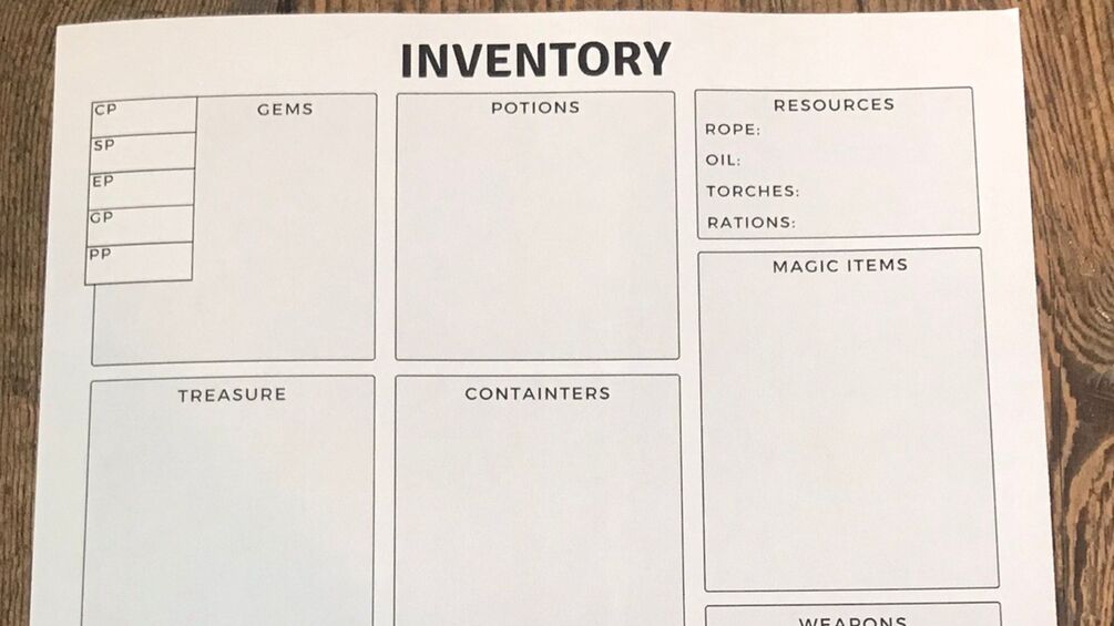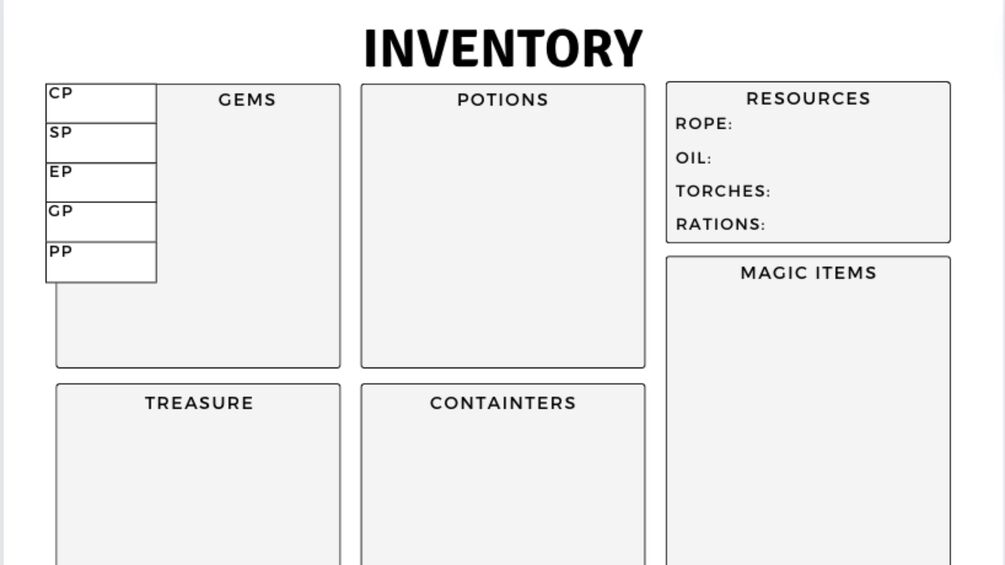 Let's be honest. The tiny "equipment" and "treasure" boxes on a character sheet are too small and can be such a pain to organize. Luckily, there's this organized inventory sheet with a full page of space to write your inventory items! Organized into boxes by item type. Font is big and easy to use for any type of player!