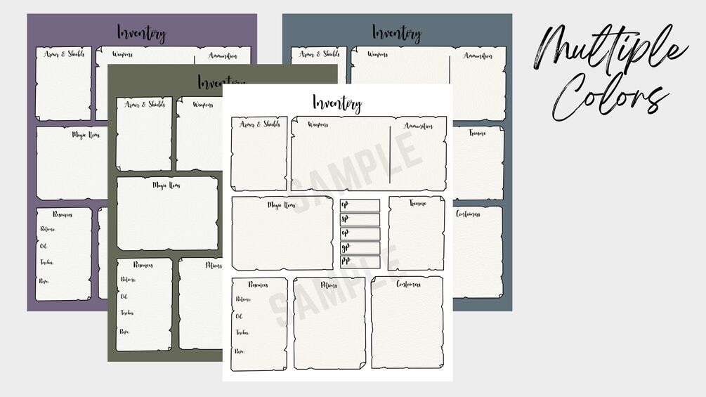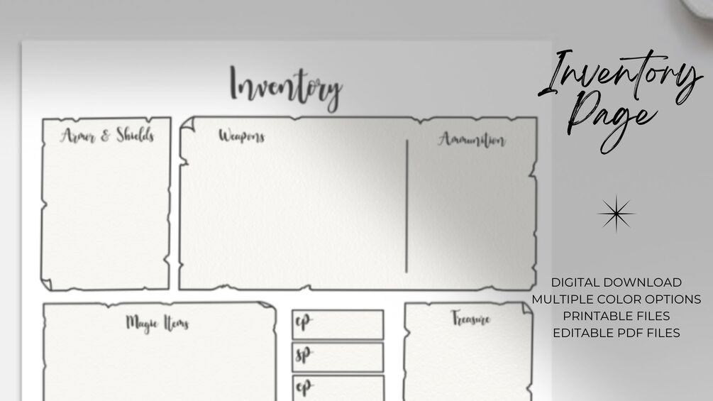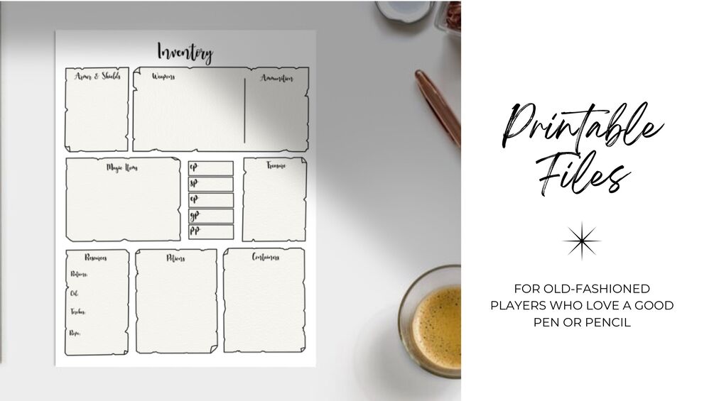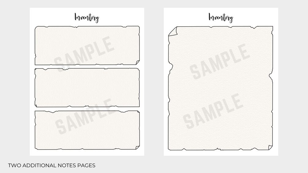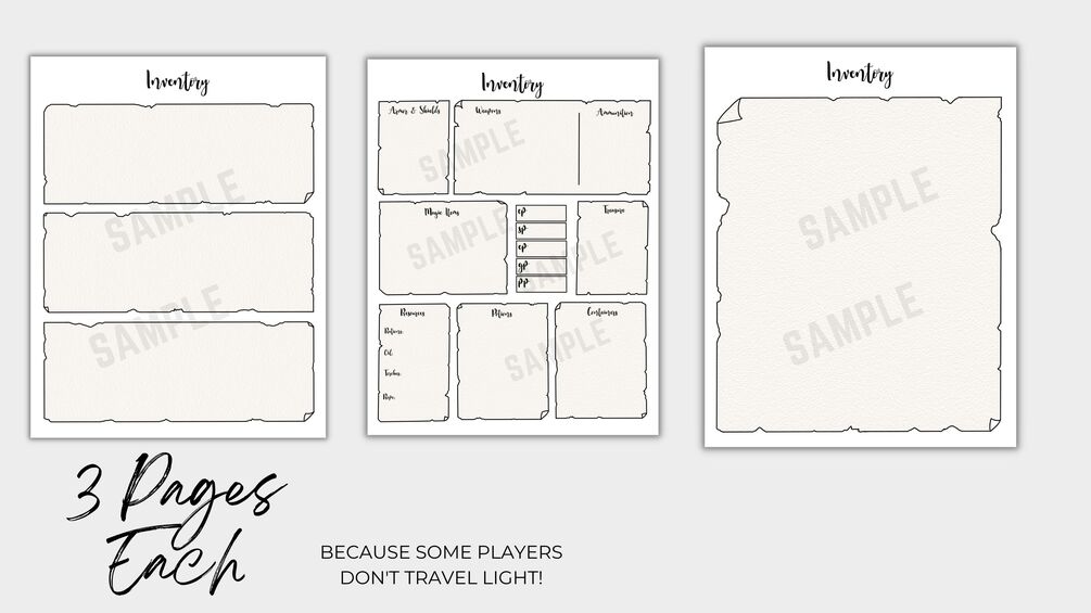 The tiny "equipment" box on a character sheet is way too small and can be such a pain to organize. And what about those players that take absolutely everything? Or those players that just simply don't travel light? Luckily, there's this organized inventory sheet with three pages of space to keep track of everything you've got in your inventory.